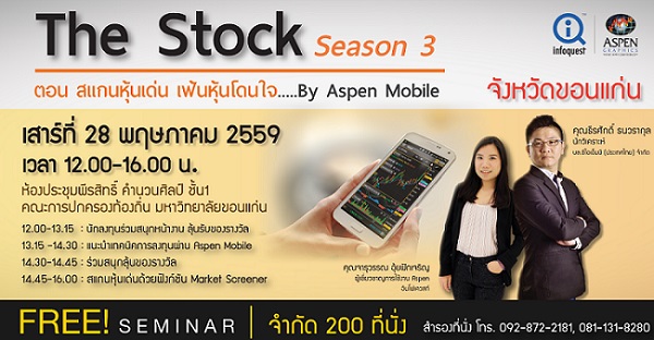 ชาวขอนแก่นพร้อมหรือยัง? ร่วมสัมมนาหุ้นฟรี! กับอินโฟเควสท์ในงาน “The Stock Season 3 ตอน สแกนหุ้นเด่น เฟ้นหุ้นโดนใจ by Aspen Mobile” เสาร์ที่ 28 พ.ค. นี้