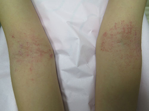 ส่วนในเด็กโตมักจะพบผื่นในบริเวณข้อพับต่างๆของแขนขา และยังคงมีอาการคันมาก ร่วมกับผิวแห้ง อาจจะพบอาการของโรคได้บริเวณผิวหนังรอบดวงตา รอบคอ รอบปาก หรือหลังใบหู มีความเป็นไปได้ที่อาการของโรคจะต่อเนื่องจนถึงวัยผู้ใหญ่ หากต่อเนื่องถึงวัยผู้ใหญ่แล้วจะยังคงมีอาการผิวแห้งเป็นขุย พร้อมอาการผิวหนังแดงอักเสบเป็นๆ หายๆ และอาจจะส่งผลให้เกิดการแพ้สารสัมผัสต่างๆได้ด้วยเช่น แพ้ผลิตภัณฑ์ที่มีกลิ่นหอมอาทิ ครีมทาผิว น้ำหอม โดยในผู้ป่วยบางรายอาจเริ่มมีอาการภูมิแพ้ในระบบอื่นๆตามมา เช่น หอบหืด ภูมิแพ้เยื่อบุจมูก ภูมิแพ้เยื่อบุตา มืออักเสบเป็นต้น