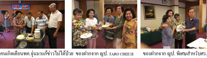 เนื่องจากเห..เกษราไปเที่ยว จึงได้ อิ๊ด “สมบูรณ์”มาทำหน้าที่แทน ทั้งเก็บเงิน จ่ายเงิน แล้วยังร้องเพลงหวานๆให้ฟังอีก ทำได้หลายหน้าที่ สวัสดิ์ นิตยา และอิ๊ดเกะ ช่วยกันบันทึกภาพ นิตยาเธอบ่นว่า สว.ทั้งหลายแอคทีพมาก ยุกยิกตลอด ไม่นั่งนิ่งๆ จนภาพไหวไปหลายภาพ ยังมีช่างภาพใส่หมวกเก๋..ฮิตเลอร์ พอมาถึงก็ถ่ายวิดิโอส่งไลน์ให้เพื่อนๆเป็นชุดแรก ประสาน น้องแมง แพะ สวัสดิ์ ผลัดกันร้องเพลงเพราะๆกล่อมเพื่อน ไพศาลเข้ามาจัดเตรียมคาราโอเกะ สักครู่ บุญชุมหิ้วกีตาร์มานั่งประจำที่ เพื่อนๆมาร่วมงานกันแต่เช้า เพียงสิบโมงนิดๆก็มากันหลายคน เดือนนี้มีผู้ชายมามากกว่าทุกครั้ง ที่มาเป็นคู่ มี ประสาน-น้องแมง สวัสดิ์-พึงพิศ สมคิด-ม้า สุธิดา-สามี มังกร-ภรรยา นอกนั้นมาเดี่ยว มีเพื่อนที่นานๆมาสักครั้งเดินเข้ามาหลายคน ชูศักดิ์ จากแพร่ ถิรวีร์ มามาดเนี๊ยบทั้งผมและเสื้อไหมไทย มังกร แหยม”สุทัศน์” ประสงค์ ประดิษฐ์ สุวพันธ์ อุดม พูลเกษ อรวรรณ ระเบียบ เฉิ่ม ยุพิน แต “แววไว” ส่วนปราณี แวะมากินให้อร่อยก่อนไปทำฟันช่วงบ่าย “เฉิ่ม” รับหน้าที่โฆษกด้วยฝีปากที่สรรคำพูดมา เรียกเสียงฮาจากเพื่อนๆที่คอยจ้องรับมุขตลอดเวลา แถมเป็นต้นเสียงร้องเพลงอวยพรวันเกิดอีกด้วย เรียกว่าทำงานคุ้มกับที่เชิญมา