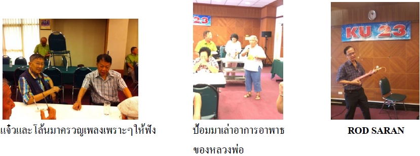 วันที่ 23 เมย. KU 23 ที่เชียงใหม่ ทำบุญให้เพื่อนๆที่ล่วงลับไปแล้ว โดยถวายสังฆทานพระสี่รูปที่วัดเชตุพน ต.วัดเกต อ.เมือง เชียงใหม่ ใกล้บ้านตึ เพื่อนๆที่ไปร่วมทำบุญที่วัดได้แก่ ตึ สาคร สุนทรี ถนัด เพ็ญแข สมใจ เล็ก บุญญนิจ และพี่บรรจบ(เขยรุ่น) และปรานอม สำหรับรายหลัง ต้องบอกว่า คาดไม่ถึง เพราะมาร่วมทำบุญ พร้อมทั้งหอบขนม แหนมหมกและมอบเงินทำบุญด้วย เจ้าตัวบอกว่า รู้ข่าวทางไลน์ ด้วยความที่ไม่เจอประนอมเป็นเวลานานมาก ทั้งปรานอมและเพื่อนๆต่างจำกันไม่ได้ ถ้าประนอมไม่เห็นเสื้อรุ่นสีเขียว ปักชื่อรุ่นที่แขน ก็คงไม่ทราบว่า ลุงๆป้าๆกลุ่มนี้คือเพื่อนรุ่นเดียวกัน ในขณะทำพิธี สว.ทั้งหลายนั่งเก้าอี้ที่พระเตรียมไว้ให้ เพราะกลัวว่าหากนั่งกับพื้นคงลุกไม่ขึ้น ยกเว้นหนึ่งเดียว คือเล็ก ซึ่งนั่งบนพรม ปรานอมแอบกระซิบถามเราว่า สว.หัวเหน่งคนที่นั่งกับพื้น คือใคร ซึ่งก็เป็นเรื่องธรรมดาที่จะจำไม่ได้ ด้วย สว.เล็ก รูปร่าง หน้าตา เปลี่ยนไปเยอะ (แต่ดูภูมิฐานนะ ขอบอก) หลังทำบุญ ทั้งหมดยกเว้นปรานอม ก็พากันไปสังสรรค์ต่อที่ร้านครัวการบินลาว ในบริเวณสนามกอล์ฟของทหารบก สังสรรค์วันนี้เพื่อนๆขาดหลายคน เช่น สมยศ อมรธัช นิจพร หมู-เรณู มุ้ย-สายสวาท และสุวิมล แต่ที่มาสมทบกับกลุ่มที่ไปวัด ก็มีสุรีย์และสงวน ซึ่งหอบผลไม้จากสวนมาฝากเพื่อนๆด้วย 1 กล่อง ผลไม้จากสวนของสงวน หน้าตาและขนาดผลเป็นมะปราง แต่รสชาติอร่อยแบบมะยงชิด ทำให้หัวข้อสนทนาระหว่างสังสรรค์อย่างหนึ่ง คือการถกเถียงว่ามันคือมะปรางหรือมะยงชิด อร่อยหรือไม่ก็คิดดู เพราะไม่ใช่แค่กิน แต่เพื่อนๆขอแบ่งกลับไปกินต่อที่บ้าน เจ้าของสวนบอกว่า มีต้นเดียวเอง และออกลูกดกมาก เนื่องจากบ้านสงวนมีต้นไม้ที่น่าสนใจหลายอย่าง ดังนั้น จึงอาจเป็นไปได้ว่า อุ้ยๆป้าๆ อาจจะบุกบ้านสงวนอีก หลังอิ่มท้อง สมใจเปิดฉากการร้องคาราโอเกะ ตามด้วยสุรีย์ ซึ่งขับกล่อมเพื่อนๆด้วยเพลงปะกิต และเพลงไทยหลายเพลง มี ถนัด เล็ก บุญยนิจ แข และพี่บรรจบ สลับฉากเป็นครั้งคราว สังสรรค์คราวนี้ไร้แอลกอฮอล์ ซึ่งไม่ทราบว่า เป็นเพราะ สว.ชายที่ชอบก๊งขาดคู่ก๊ง หรือกลัวบาป เพราะรับศีลจากพระที่วัด หรือมันร้อน กันแน่ **