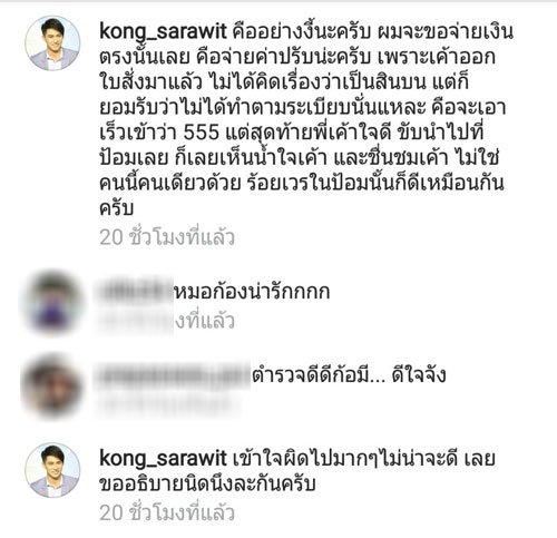 โดยล่าสุด หมอก้องก็ได้ คอมเมนต์ชี้แจงต่อมาว่า ไม่ได้คิดว่าเป็นการติดสินบน เพียงจะขอจ่ายค่าปรับตรงนั้น แต่ก็ยอมรับว่าไม่ได้ทำตามระเบียบ