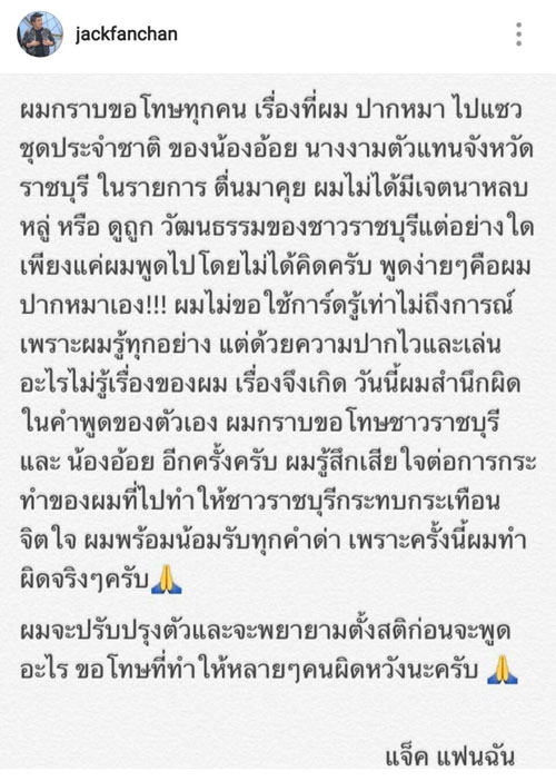 ล่าสุด แจ็ค แฟนฉัน ได้โพสต์ข้อความขอโทษผ่านอินสตาแกรม @jackfanchan ว่า ไม่มีเจตนาที่จะลบหลู่วัฒนธรรมของชาวราชบุรีแต่อย่างใด พร้อมยอมรับว่าเป็นเพราะความปากไว ปากหมาของตัวเอง และรู้เท่าไม่ถึงการณ์