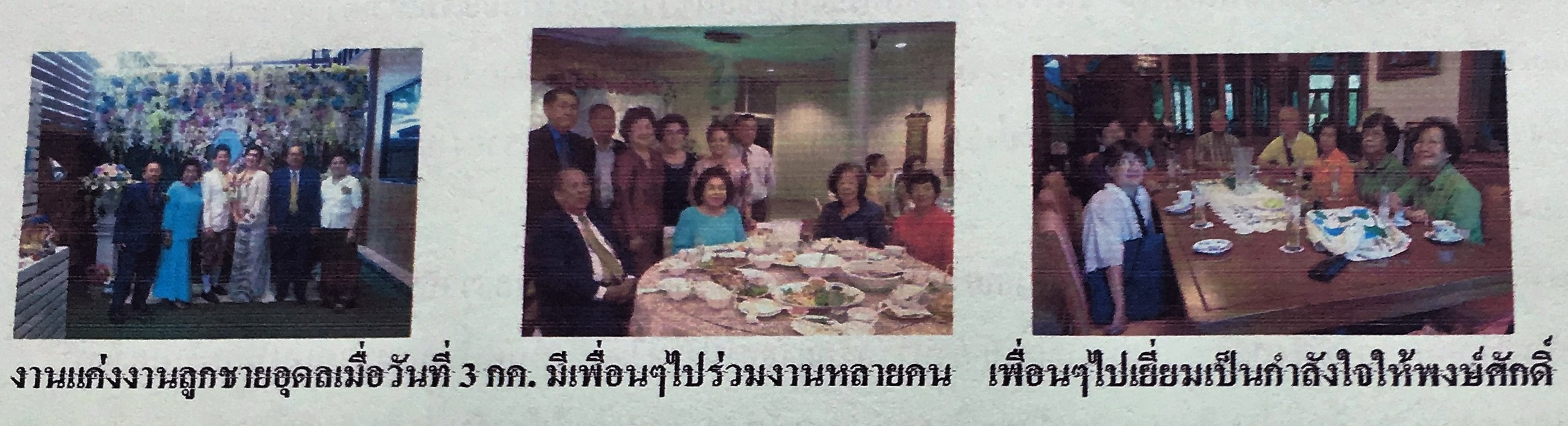 ช่วงนี้พวกเราได้รับข่าวเศร้าจากการสูญเสียคนที่รักในครอบครัวที่มีอันต้องพลัดพรากจากไปอย่างที่ไม่มีวันกลับมาเริ่มจากการสูญเสียลูกชายที่กำลังมีอนาคตก้าวไกลของ ** ผู้ว่าสมาน ** เมื่อปลายเดือนมิย. พอต้นเดือนกค.มารดาของ ** ดร.ถิรวีร์ ** ก็ได้เสียชีวิตมีการตั้งศพที่วัดธาตุทอง และมีการพระราชทานเพลิงศพภรรยาของ ** อ.อุดม พูลเกษ ** ที่วัดเทพศิรินทร์ เมื่อวันที่ 3 กค.ไปเรียบร้อยแล้วก็ขอแสดงความเสียใจมายังครอบครัวของเพื่อนๆมา ณ ที่นี้ ที่ป่วยไข้มีข่าวว่า ** อัจฉรา – แจ๊ด ** แฟน ** Choob Richard ** ป่วยเป็นไข้เลือดออก มีเพื่อนทางเหนือไปเยี่ยมให้กำลังใจ ** เสี่ยพงษ์ศักดิ์ ** ที่ทำ Balloon เส้นเลือดเข้าหัวใจ 1 เส้น เสี่ยบอกว่าใช้เวลานอนรพ.แค่วันสองวันทำเสร็จออกมาร่างกายฟิตเปรี๊ยะยิ่งกว่าเดิมเลยขอประชาสัมพันธ์ให้เพื่อนๆที่มีอาการของโรคหัวใจให้รีบไปพบแพทย์โดยด่วนก่อนที่จะสายเกินการ รวมทั้ง ** สม ใจ ** ที่ไปผ่าลอกต้อดวงตาข่าวดีก็มีเมื่อวันที่ 3 กค.2559 ก็มีพิธีมงคลสมรสลูกชายของ ** อุดล – กาญจนา ** มีเพื่อนๆไปร่วมแสดงความยินดีกันหลายคน วันสังสรรค์เดือนมิย.คนเขียนข่าวไม่อยู่ไปลอยเรือเท้งเต้งอยู่แถบทะเลเมอดิเตอเรเนียนจึงไม่มีบรรยากาศในงานสังสรรค์ว่าเป็นอย่างไรแต่ก็ได้อาศัยรูปจาก Line ที่เพื่อนๆส่ง และต่อมาก็ได้รับรูปในงานจาก ** อิ๊ดเกะ ** + กับข่าวของ KU.23 สังสรรค์ที่เชียงใหม่ รายงานข่าวโดย ** อุ้ยตึ ** ดังนี้