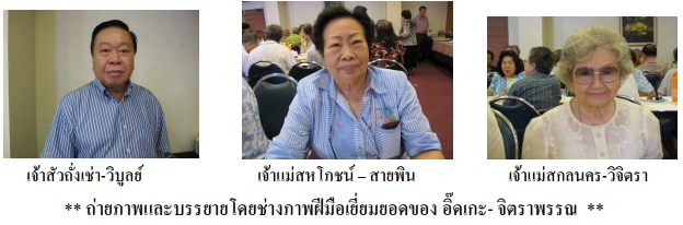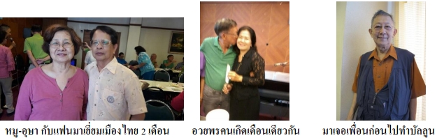 สังสรรค์เดือนกรกฎาคมเป็นเดือนที่มีเรื่อง surprise หลายเรื่อง เช่นมีเพื่อนเราตั้งแต่จบไม่เคยมาเจอหน้าเจอตาเพื่อนฝูงเลยคิดดูว่าเป็นเวลาถึงกว่า 50 ปีพอมางานเมื่อวันที่ 22 กค.ยิ่งทำให้เพื่อนแปลกใจไปตามๆกันเพราะมาถึง ** ดร.สงคราม ** ขอให้เธอแนะนำตัวเองเพราะเพื่อนๆส่วนใหญ่คงจำเธอไม่ได้แต่เธอทำให้เพื่อนๆแปลกใจก็คือพอได้ไมค์มาเธอก็ตั้งหน้าตั้งตาร้องเพลงอย่างเดียวไม่มีการขวยเขินเอียงอายแต่อย่างไรแถมร้องแบบนักร้องอาชีพต้องอายเลยทีเดียว หลังร้องเพลงจนเป็นที่พอใจแล้วเธอถึงมากล่าวทักทายและเปิดเผยตัวเองว่าเธอชื่อ ** วัลลภา ** หรือ ** วัลลภา อิสรีขัยวงศ์ ** จบจากคณะเศรษฐศาสตร์ จบแล้วมีภาระต้องดูแลครอบครัวเลยไม่มีเวลามาสังสรรค์กับเพื่อนฝูงเลยวันนี้เป็นวันแรกที่มา มีเพื่อนๆเล่าให้ฟังว่าเธอชอบร้องเพลงจนได้รางวัลนักร้องเพลงสุนทราภรณ์เธอเล่าต่อไปว่าจากการที่เธอต้องดูแลครอบครัวมาเป็นเวลานานทำให้ไม่มีเวลาไปมองหาคนรู้ใจมาจนถึงเดี๋ยวนี้ที่อายุเธอก็ล่วงเลยมาภึง 74 ปีแล้วก็เลยมีเพื่อนๆแซวว่าเพิ่งมีเพื่อนชายรุ่นเราเพิ่งตกพุ่มม่ายมามาดๆควรลองคบหากันดีไหมคนที่เพื่อนๆแซวแนะนำก็คือ ** อ.อุดม ** นั่นเอง เรื่อง surprise อีกเรื่องคงจำ** อุษา – หมู ** ที่ไปตั้งรกรากทำงานอยู่ที่ออสเตรเลียเวลากลับมาเยี่ยมบ้านเมืองไทยก็มักเข้ามาทักทายเพื่อนที่ สหโภชน์อยู่เสมอ เดือนนี้ หมู มีกำหนดมาเยี่ยมเมืองไทย 2 เดือนก็แวะมาทักทายเพื่อนๆที่ สหโภชน์เช่นเดิมแต่มีพิเศษที่หนีบแฟนมาด้วยซึ่งแฟนของ หมูน่ารักมาก มาร่วมร้องเพลงและเต้นรำกับพวกเราอย่างสนุกสนานเป็นกันเองเหมือนคบกันมานานปี ก็ขอให้มาเยี่ยมเมืองไทยบ่อยๆนะ