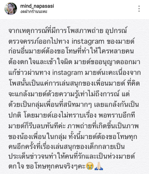 ล่าสุด สาวมายด์ก็ได้โพสต์ข้อความชี้แจงผ่านอินสตาแกรมเกี่ยวกับกรณีดังกล่าวว่า ขอโทษที่ทำให้หลายคนตกใจและเข้าใจผิด และขอชี้แจงว่าโพสต์นั้นเป็นแค่การแกล้งเล่นของเพื่อนสนิทด้วยความรู้เท่าไม่ถึงการณ์เท่านั้น