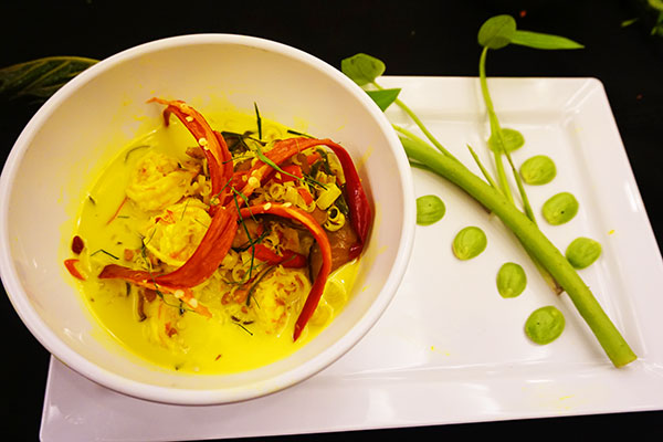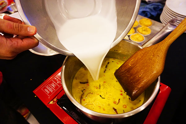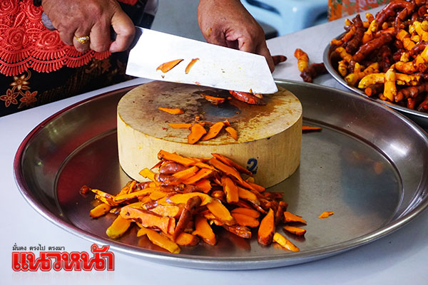 จากนั้นเราได้เดินทางไปต่อที่ บ้านเขาตำหนอน ต.ถ้ำทองหลาง อ.ทับปุด แหล่งผลิตและศูนย์แปรรูปผลิตภัณฑ์ขมิ้นชันคุณภาพดีที่ได้รับการรับรองจากองค์การอาหารและยา (อย.) และเป็นผลิตภัณฑ์โอทอประดับ 5 ดาว โดยกลุ่มอาชีพสตรีบ้านเขาตำหนอนได้สาธิตขั้นตอนการผลิตเบื้องต้นให้ชม ก่อนที่จะกลายเป็นผลิตภัณฑ์ต่างๆ อาทิ ผงขมิ้น แคปซูลขมิ้น พริกแกงขมิ้น ส่งขาย นอกจากนี้ ยังมี “ขนมเต้าส้อ” ขนมขึ้นชื่อของจังหวัดพังงา ที่ทำกันแบบสดใหม่ส่งกลิ่นหอมชวนทาน ให้เราได้ชิมและช็อปกลับไปเป็นของฝากกันอย่างเต็มที่ เป็นการเรียกน้ำย่อยก่อนจะเดินทางกลับที่พักเพื่อเตรียมตัวทำกิจกรรมคุกกิ้งอาหารถิ่นกับเมนูที่มีชื่อว่า “จอแหร้ง”
