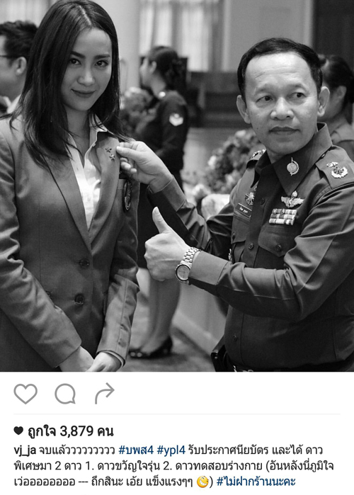 ล่าสุด สาวจ๋าก็ได้รับเกียรติบัตร และได้ติดดาว 2 ดวง ซึ่งหลักสูตรนี้จบมาไม่ได้เป็นตำรวจโดยตรง แต่สามารถเป็นอาสาสมัคร ช่วยเหลืองานตำรวจได้