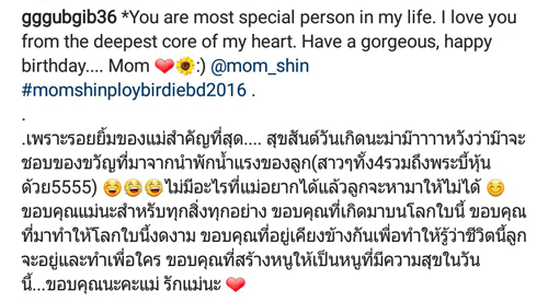 ขอบคุณแม่นะสำหรับทุกสิ่งทุกอย่าง ขอบคุณที่เกิดมาบนโลกใบนี้ ขอบคุณที่มาทำให้โลกใบนี้งดงาม ขอบคุณที่อยู่เคียงข้างกันเพื่อทำให้รู้ว่าชีวิตนี้ลูกจะอยู่และทำเพื่อใคร ขอบคุณที่สร้างหนูให้เป็นหนูที่มีความสุขในวันนี้…ขอบคุณนะคะแม่ รักแม่นะ
