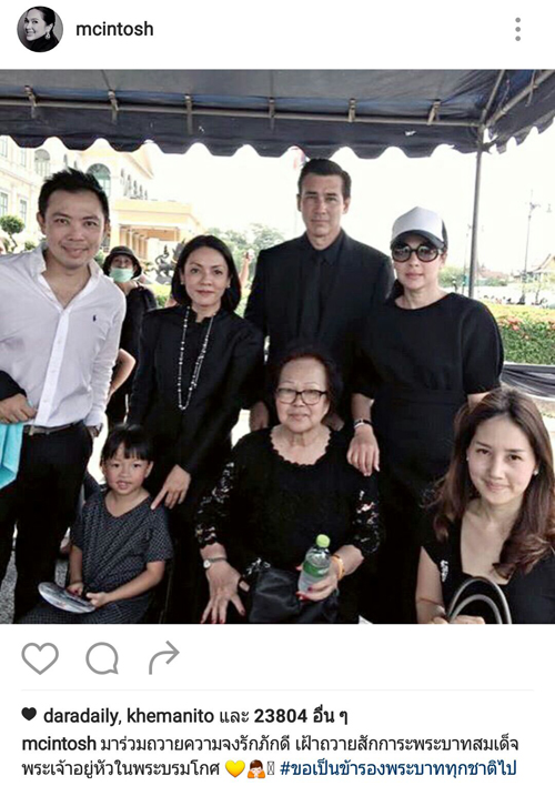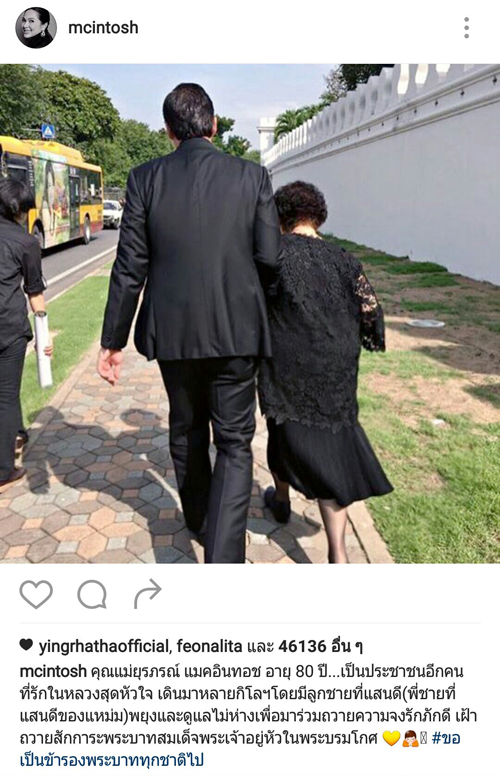 ซึ่งแหม่ม คัทลียา แมคอินทอช ได้โพสต์ภาพขณะที่พี่ชายวิลลี่กำลังพยุงคุณแม่ พร้อมข้อความว่า“คุณแม่ยุรภรณ์ แมคอินทอช อายุ 80 ปี…เป็นประชาชนอีกคนที่รักในหลวงสุดหัวใจ เดินมาหลายกิโลฯโดยมีลูกชายที่แสนดี(พี่ชายที่แสนดีของแหม่ม)พยุงและดูแลไม่ห่างเพื่อมาร่วมถวายความจงรักภักดี เฝ้าถวายสักการะพระบาทสมเด็จพระเจ้าอยู่หัวในพระบรมโกศ #ขอเป็นข้ารองพระบาททุกชาติไป”