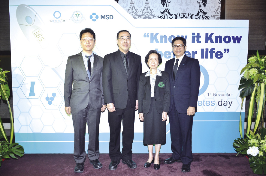 เนื่องในวันเบาหวานโลก ซึ่งตรงกับวันที่ 14 พฤศจิกายนของทุกปี สมาคมโรคเบาหวานแห่งประเทศไทยฯ ร่วมกับ บริษัท เอ็มเอสดี (ประเทศไทย) จำกัด จัดงาน “เบาหวาน…รู้จักเพื่อป้องกัน รู้ทันเพื่อควบคุม” ร่วมรณรงค์ให้ความสำคัญในการคัดกรองเบาหวาน โดยมีศ.เกียรติคุณ พญ.วรรณี นิธิยานันท์ นายกสมาคมโรคเบาหวานแห่งประเทศไทยฯ พร้อมด้วย ศ.คลินิก นพ.ชัยชาญ ดีโรจนวงศ์, นพ.เพชร รอดอารีย์, นพ.เอกลักษณ์ วโนทยาโรจน์ และ พ.ต.นพ.สรวิชญ์ สุบุญมาร่วมงานด้วย ณ ห้องแอสเตอร์ 3 โรงแรมเซนต์รีจิสกรุงเทพฯ เมื่อเร็วๆ นี้