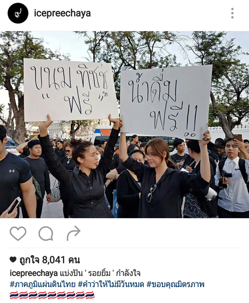 ล่าสุด ไฮโซสาว แหวนแหวน ปวริศา ร่วมกับเพื่อนๆ อาทิ น้ำชา ชีรณัฐ, ตอง ภัครมัย ,เกรซ กาญเกล้า ,ไอซ์ ปรีชญา ฯลฯ ร่วมกันนำน้ำดื้ม ขนม และกระดาศทิชชู่ แจกให้แก่ผู้ที่เดินทางมาร่วมลงนามถวายความอาลัยพระบาทสมเด็จพระเจ้าอยู่หัวในพระบรมโกศ
