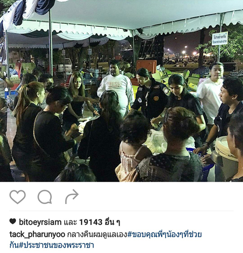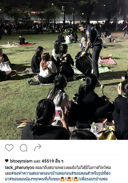 โดยหนุ่มแทคขอทำความดีเพื่อพ่อ ด้วยการไปช่วยเก็บขยะที่บริเวณท้องสนามหลวง และบริการแจกน้ำและของกินต่างๆ ให้กับประชาชนที่มารอเข้าถวายสักการะเบื้องหน้าพระบรมฉายาลักษณ์ และลงนามสมุดหลวงถวายความอาลัยพระบรมศพ ซึ่งหนุ่มแทคได้โพสต์ข้อความว่า กลางคืนผมดูแลเอง#ขอบคุณพี่ๆน้องๆที่ช่วยกัน#ประชาชนของพระราชา