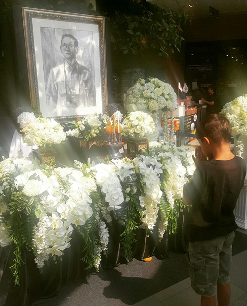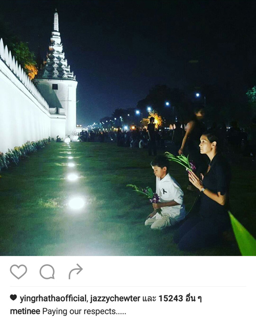 โดยที่ก่อนหน้านี้ คุณแม่ลูกเกดก็ได้พาลูกชายไปร่วมถวายความอาลัยพระบาทสมเด็จพระปรมินทรมหาภูมิพลอดุลยเดช ด้วยกันที่บริเวณกำแพงวัดพระแก้ว