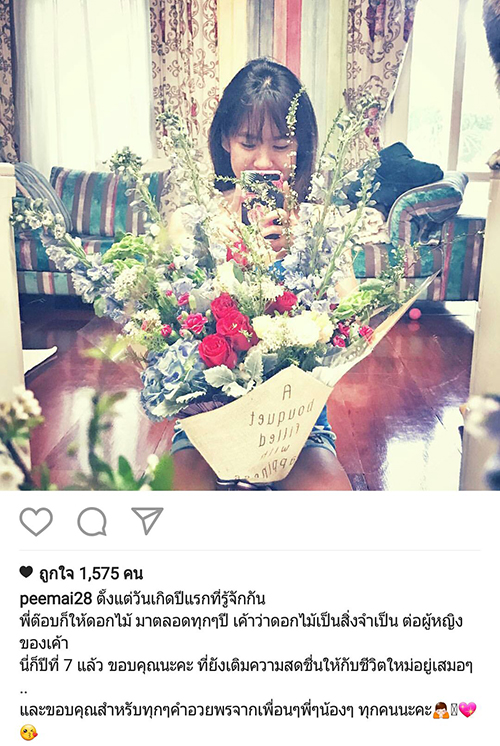 ล่าสุด ในวันเกิดของสาวปีใหม่ อายุครบ 32 ปี เมื่อวานนี้ (28 พ.ย.) ป๋าต๊อบก็ไม่พลาดที่จะจัดเซอร์ไพรส์เป็นดอกไม้ช่อโตให้เป็นของขวัญ ซึ่งสาวปีใหม่ก็ปลื้มๆ แชะภาพคู่ดอกไม้พร้อมข้อความหวานๆ ว่า