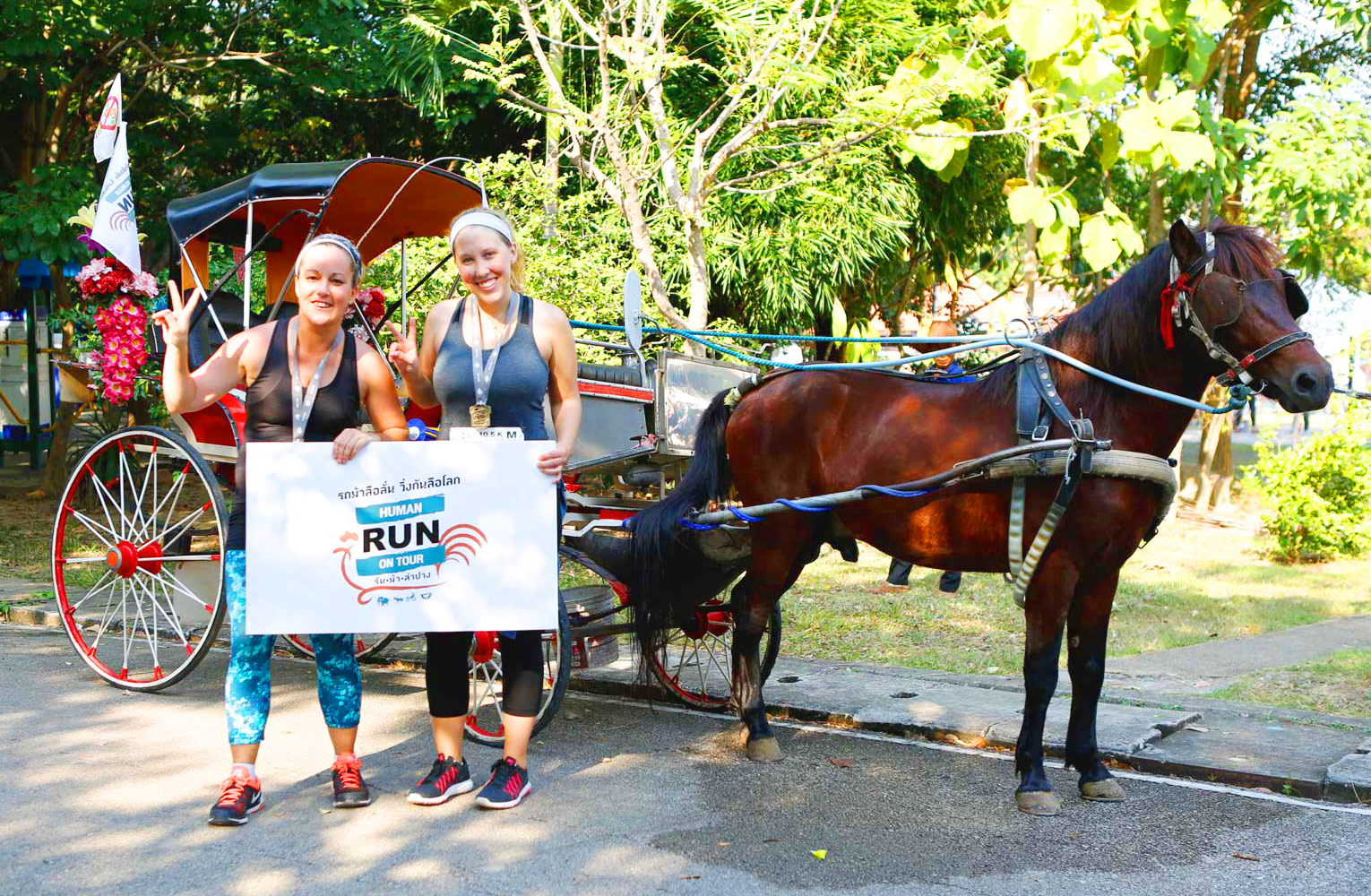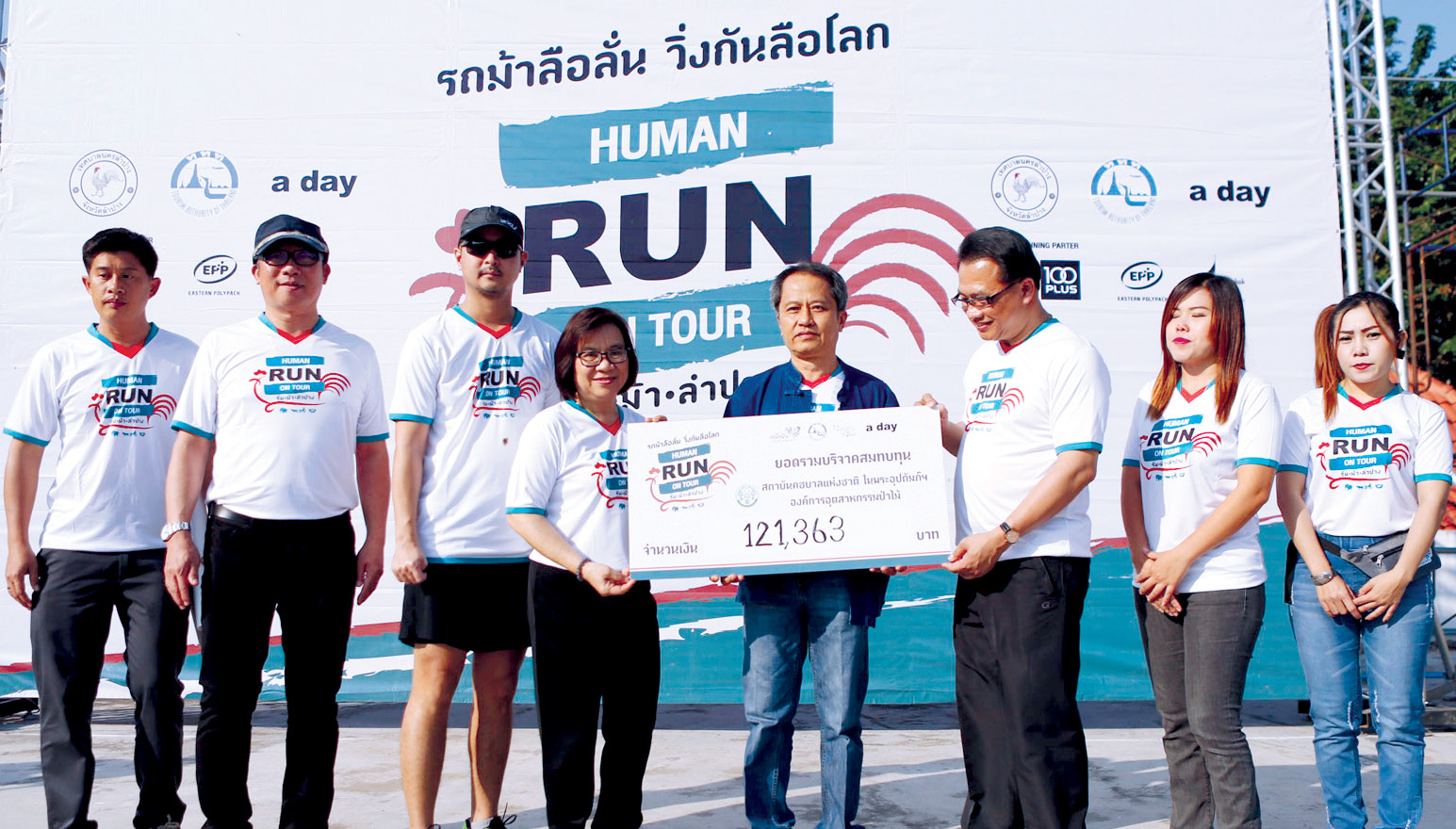 สุจิตรา จงชาณสิทโธ รองผู้ว่าการด้านตลาดในประเทศ ททท. นำทัพนักวิ่ง และ วิบูลย์ นิมิตวานิช ผอ.ภูมิภาค ภาคเหนือ ททท.,กิตติภูมิ นามวงศ์ นายกเทศมนตรีนครลำปาง ,ช้างน้อย กุญชร ณ อยุธยา ผอ.ฝ่ายการตลาด นิตยสารอะเดย์ ส่งมอบเงินบริจาค 121,363 บาท จากการผนึกกำลังจัดกิจกรรม “HUMAN RUN ON TOUR รัน ม้า ลำปาง” โดยมี วีระชัย ทัศนภักดิ์ หัวหน้าฝ่ายบริหารทั่วไป สถาบันคชบาลแห่งชาติ ในพระอุปถัมภ์ฯ องค์การอุตสาหกรรมป่าไม้ พร้อมคณะร่วมรับมอบ ณ สวนเขลางค์นคร จ.ลำปาง