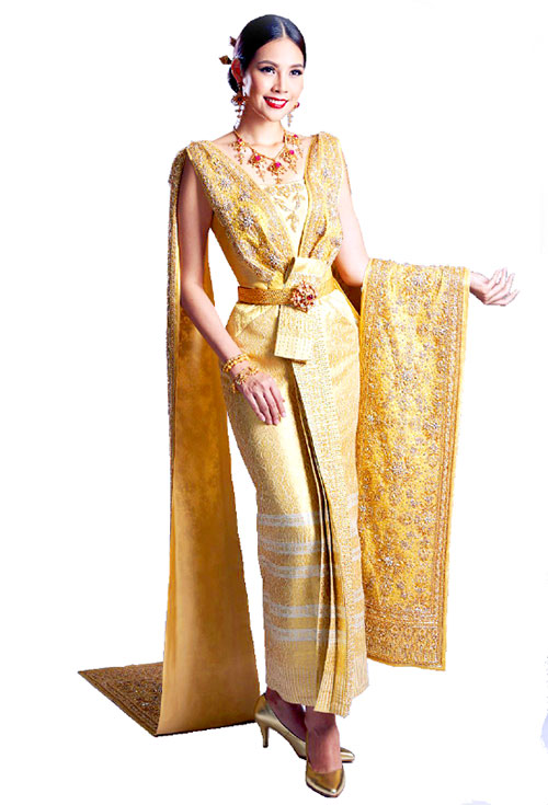 สำหรับชุดประจำชาติ เป็นชุดไทยประยุกต์ ใช้สำหรับโชว์บนเวทีรอบตัดสิน ออกแบบและตัดเย็บโดย เกสินี กลํ่าอยู่สุข และ สุดจิตร์ สุดจิตต์ แห่งแบรนด์ ฟินาเล่ เวดดิ้ง สตูดิโอ โชว์ผลงานการปักและความละเอียดของงานฝีมือสุดประณีตของช่างไทย สื่อให้เห็นความงดงามแห่งดอกไม้และธรรมชาติ ความงดงามที่สุดอ่อนโยนบนแผ่นดินไทย ตัวชุดตัดเย็บด้วยผ้าไหมไทยยกใหญ่ทอยกลายในตัว บริเวณด้านในตัดเย็บเป็นโครงชุดไทยติดกัน เพื่อความสะดวกในการเดิน ช่วงอกออกแบบสร้างแพทเทิร์น แยกชิ้นออกจากตัวเสื้อทั้งสองผืน โดยวาดลวดลายไทยจับจีบเป็นแนววีแบบบางเบา เพิ่มความงามระหงของผู้สวมใส่ ตัวสไบสองผืนเป็นลวดลายเดียวกัน เพื่อติดช่วงบริเวณไหล่ ปล่อยปลายลากยาวจรดปลายผืน เพิ่มความสง่างามเวลาเดิน ส่วนด้านหน้าตัวกระโปรงจับจีบหน้านาง โชว์ความวิจิตรของงานปักสุดลํ้าค่า ด้วยปล้องอ้อยสีทองและลูกปัดขนาดเล็ก แต่งแต้มความระยิบระยับของคริสตัลเพชรสวาลอฟกี้ ที่บรรจงปักลงบนผืนผ้าแบบเม็ดต่อเม็ด สวมใส่พร้อมเครื่องประดับฉบับโบราณ โดยแบรนด์กรุช่างทองโบราณ