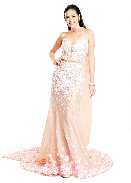 ส่วนชุดราตรี ใช้สำหรับประกวดรอบตัดสิน ออกแบบและตัดเย็บโดยห้องเสื้อ เมอเรียด แกรนด์มอนด์ ภายใต้แนวคิด “ฟลอร่า ดีไลท์” แสดงถึงตัวตนของมิสไทยแลนด์เวิลด์ ที่เปรียบเสมือนดอกไม้ ที่มีความสดชื่น สดใส โดยใช้โทนสีชมพู การตัดเย็บใช้ผ้าซีทรูสีนู้ด ปักด้วยดอกไม้ไล่สี เพิ่มลูกเล่นที่ผ้าพาดคอ เพื่อความพลิ้วไหว