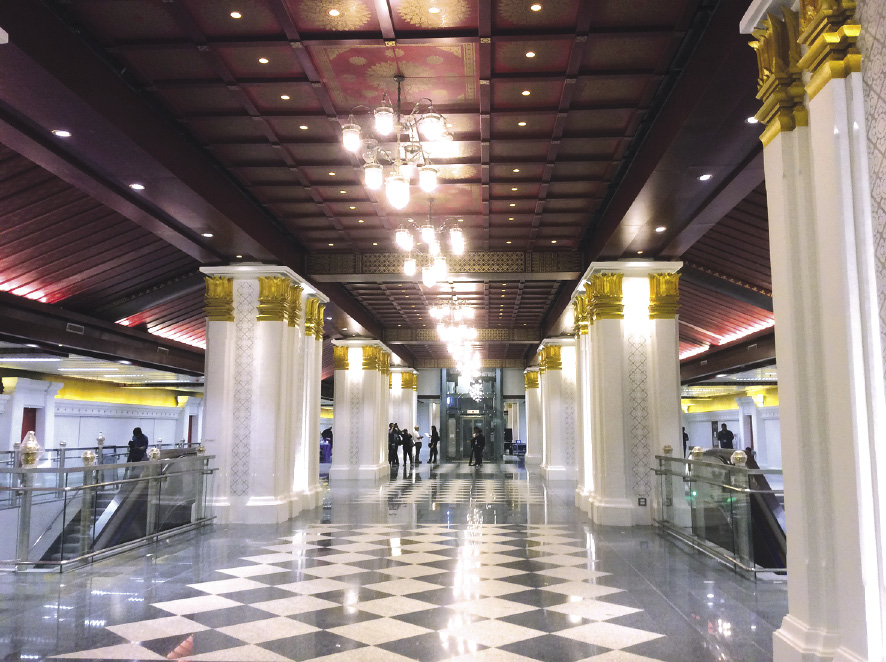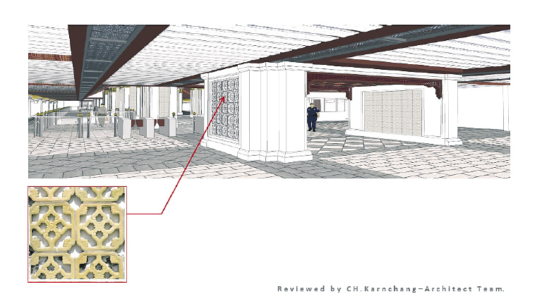 “รศ.ดร.ภิญโญ” อธิบายต่อว่า การออกแบบนั้นจะมี “เสาสดมภ์” ที่ตั้งตระหง่านอยู่ระหว่างทางเดิน มีองค์และฐานเสาตามทำเนียบของสถาปัตยกรรมไทย ลงลายกระเบื้องเป็น “ดอกพิกุล” ปลายเสาประดับด้วย “บัวจงกล” ปิดทองคำเปลว พื้นและผนังจำลองมาจากกำแพงเมือง ลงลายกระเบื้องเป็น “ดอกประจำยาม” ประดับด้วยเสาเสมาของพระบรมมหาราชวัง เช่นเดียวกับพื้นเพดานที่ตกแต่งด้วย “ลายไทย” อันวิจิตร เพดานเป็นลายฉลุแบบ “ดาวล้อมเดือน” ปิดทองคำเปลว มองเห็นได้เหมือนกับพระบรมมหาราชวัง หรือพระอุโบสถ ที่ช่างหลวงหรือช่างราชสำนักเคยทำไว้