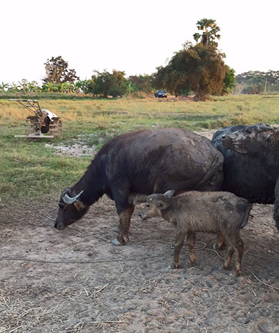 โคกระบือที่คณะของเราไถ่ชีวิตมาจากโรงฆ่าสัตว์นั้นมีทั้งโคกระบือท้องโคกระบือแม่ลูก และโคกระบือวัยหนุ่ม-สาว และเป็นที่น่ายินดีเป็นอย่างมากเพราะเมื่อก่อนปีใหม่ไม่กี่วันกระบือที่เรามอบให้กับสวนผักบำบัดได้คลอดลูกออกมา ซึ่งพวกเราตั้งใจว่าจะไปเยี่ยมพวกเขาด้วยกัน (โดยกำหนดจะเดินทางไปช่วงหลังวันตรุษจีน ซึ่งอาจจะเป็นช่วงต้นเดือนกุมภาพันธ์ คอลัมน์นี้จะแจ้งรายละเอียดการเดินทางที่แน่นอนให้ทราบในโอกาสต่อไป)