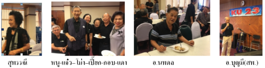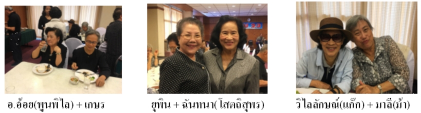หลังจากมีสมาชิกรุ่นฯทยอยกันมาที่ห้องฯสหโภชน์มากพอประมาณเพื่อนๆก็ได้มอบกระถางดอกไม้ให้ ท่านประธานรุ่นฯ ** ดร.สายพิน ** ที่ได้ทำหน้าที่อย่างเข้มแข็งและเสียสละ อึกคนที่ได้รับมอบกระถางดอกไม้เช่นกันก็คือ ** DJ. ไพศาล ** ที่ทำหน้าที่เป็นทั้ง DJ. และ Trainer นักร้องของรุ่นทำให้แต่ละเดือนมีนักร้องเข้าคิวต่อแถวขึ้นไปร้องกันมากมาย อีกหน่อย DJ.จะส่งลูกทีมไปประกวดในรายการ ไมค์ทองคำ หารายได้พิเศษ ในวัน Home ปีนี้ก็มีเพื่อนๆทั้งหน้าเก่าและหน้าใหม่มาร่วมงานมากเหมือนเช่นทุกปีและขออภัยที่ลงรูปได้น้อยเพราะอยากให้เพื่อนๆที่ไม่ได้มางานได้เห็นหน้าค่าตาเพื่อนที่นานๆเจอกันทีว่าจะจำกั่นบ่ได้ก่อ เช่น ** อ.อ้อย – พูนพิไล ** ที่นานๆจะมาร่วมงานแต่จะเจอบ่อยใน Face book ไม่รู้ตอนนี้ไปกราบพระบรมศพพระบาทสมเด็จรัชกาลที่ 9 ถึง 10 ครั้งแล้วหรือยัง คนนี้ก็ไม่ค่อยได้มาเพราะจะจะอยู่ในศีลในธรรมนานๆจะออกมาสู่โลกภายนอกทีจะมีธรรมะดีๆส่งมาให้เพื่อนๆทาง Line อยู่ประจำเพื่อนผู้เคร่งในศีลในธรรมผู้นี้ก็คือ ** เกสร ** นั่นเองมาวันนี้เลยจ่ายค่าอาหารเป็นเงิน 1,000 บาท(สาธุ) รุ่นเรามีชื่อสาวโรงงานหลายคนวันนี้มางาน 1 คนถ้าเจอข้างนอกคงจำไม่ได้เพราะดูหน้าตาและรูปร่างแล้วยังอ่อนกว่าวัยเธอคือ ** ฉันทนา ** นามสกุล โสตถิสุพร(แต่ไม่โสด) จากคณะเศรษฐศาสตร์ นานๆมาก็เลยมอบค่าอาหารพิเศษ 500 บาท อีกคนเคยมาบ่อยแต่ตอนหลังป่วยเลยนานๆมาครั้งก็คือ ** สุพรรณี ** รูปร่างหน้าตายังสวยเหมือนเดิม รุ่นเรามีชื่อ ลัดดา 2 คน วันที่ 2 นี่มา 1 คนเป็นคนที่เจอไม่เป็นรูปในต่างประเทศหรือไม่ก็เป็นรูปทำบุญทำทานประจำคือ ** ลัดดา เอ **(คนสรวมหมวกขวามือสุด ในรูปหมู่รูปที่ 3 ) ฝ่ายชายที่มากันปีละครั้ง 2 ครั้งก็มี ** ประกอบ ** ที่อยู่ตากฟ้า นครสวรรค์มักจะมาวัน Home เป็นอย่างน้อยปีละครั้ง เช่นเดียวกับ ** ศ.ดร.เอิบ ** ที่มักมาร่วมวางพวงมาลาแต่เสียดายปีนี้มาไม่ทัน** อ.นพดล ** เสถียร ** อ.บุญมี (สพ.) ** กับ ** มีชีย ** ก็มาบ้างเป็นครั้งเป็นครา เจ้าสัวใหญ่ ** เสี่ยอูม – วิบูลย์ ** นอกจากจะจ่ายค่าอาหาร 500 บาทแล้วยังมี วิสกี้ 1 ขวด ไวน์ และแชมเป็ญมามอบให้รุ่นฯโดยมี ** ดร.ศรัณย์ ** เป็นตัวแทนรุ่นเป็นผู้รับมอบ
