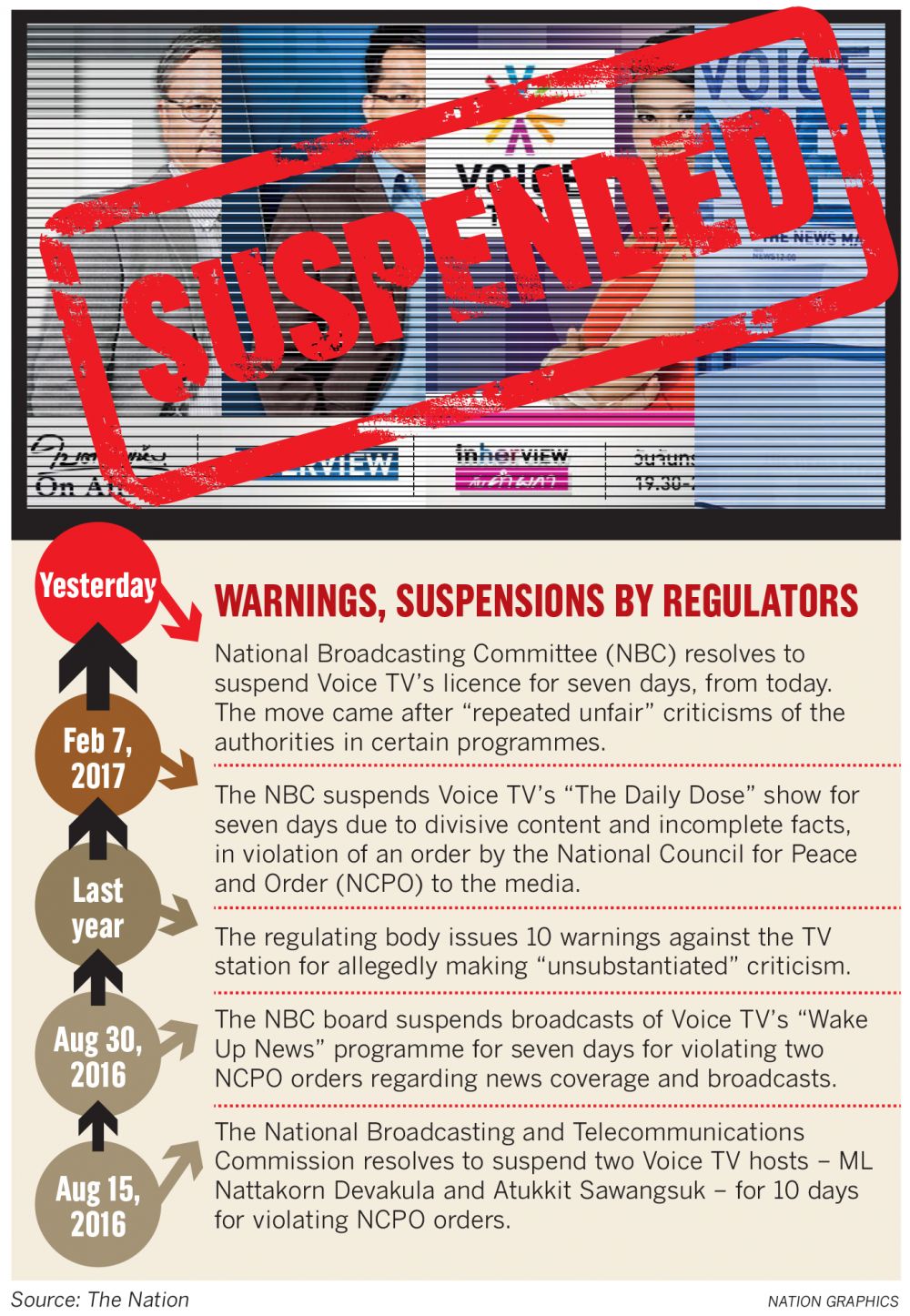 VOICE TV’s operational licence will be suspended for seven days after the National Broadcasting and Telecommunications Commission (NBTC) yesterday alleged the station had engaged in repeated wrongful conduct.