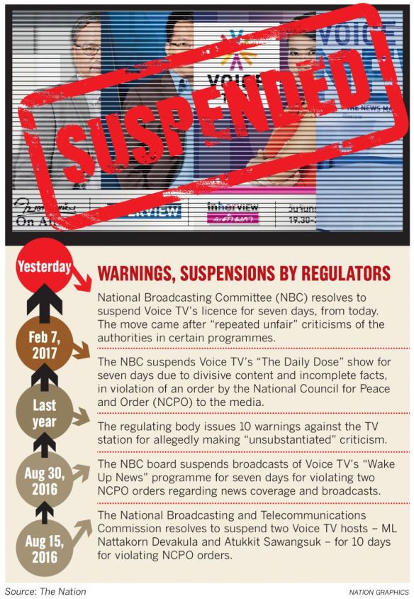 In the meantime, the programme content would be broadcast via online channels both on its website voicetv.co.th and its Facebook page Voice TV 21.