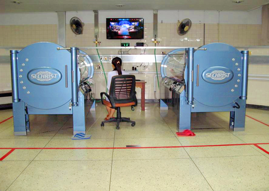 ผศ.นพ.เธียรไชย ภัทรสกุลชัย หน่วยศัลยกรรมศีรษะและลำคอ มะเร็งวิทยาและศูนย์บำบัดด้วยออกซิเจนความกดบรรยากาศสูงคณะแพทยศาสตร์ มหาวิทยาลัยเชียงใหม่ กล่าวว่า “การรักษาผู้ป่วยด้วยออกซิเจนความดันบรรยากาศสูง Hyperbaric Oxygen Therapy (HBOT)”ด้วยเครื่อง Hyperbaric Chamber ในระยะแรกถูกนำมาใช้อย่างกว้างขวางทางเวชศาสตร์ใต้นํ้าใช้รักษาผู้ป่วยภาวะสมองขาดเลือดจากการอุดตันของฟองอากาศในนักดำนํ้าและฟองก๊าซไนโตรเจนในกระแสเลือดไปอุดตันตามส่วนต่างๆ ของร่างกายหรือที่เรียกว่าโรคน้ำหนีบ เครื่องนี้สามารถเพิ่มความดันทำให้ฟองอากาศที่อุดตันในเส้นเลือดมีขนาดเล็กลง ทำให้เลือดและออกซิเจนสามารถไหลเวียนไปเลี้ยงสมองและส่วนต่างๆ ได้ดีขึ้น