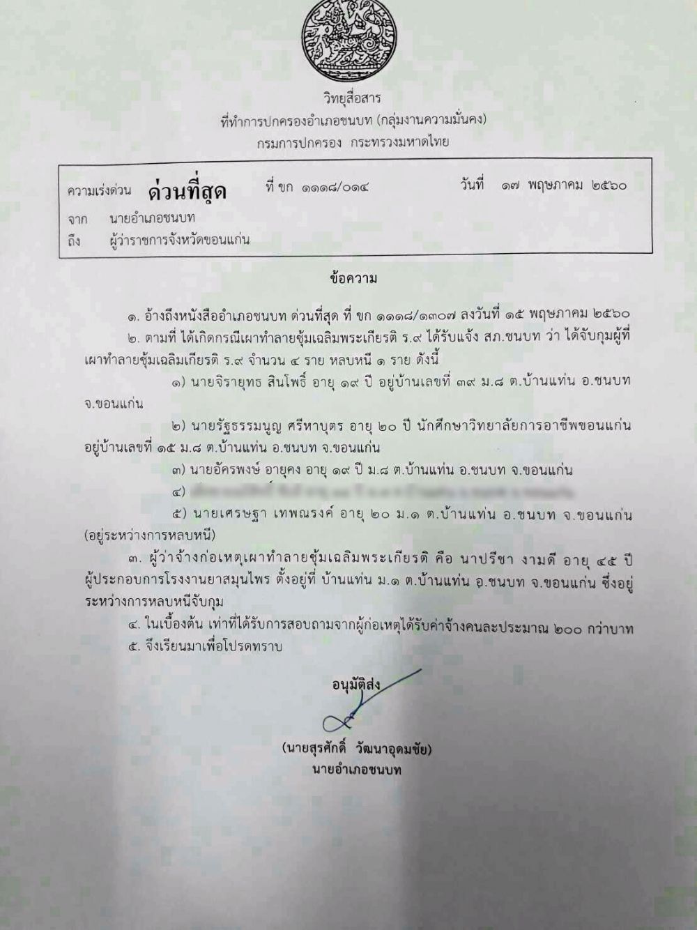 Police in northeastern province of Khon Kaen have detained four suspects, including a 14-year-old boy, who were allegedly hired to burn down an arch set up to honour of His Majesty the late King Bhumibol Adulyadej, in Chonnabot district on Monday.