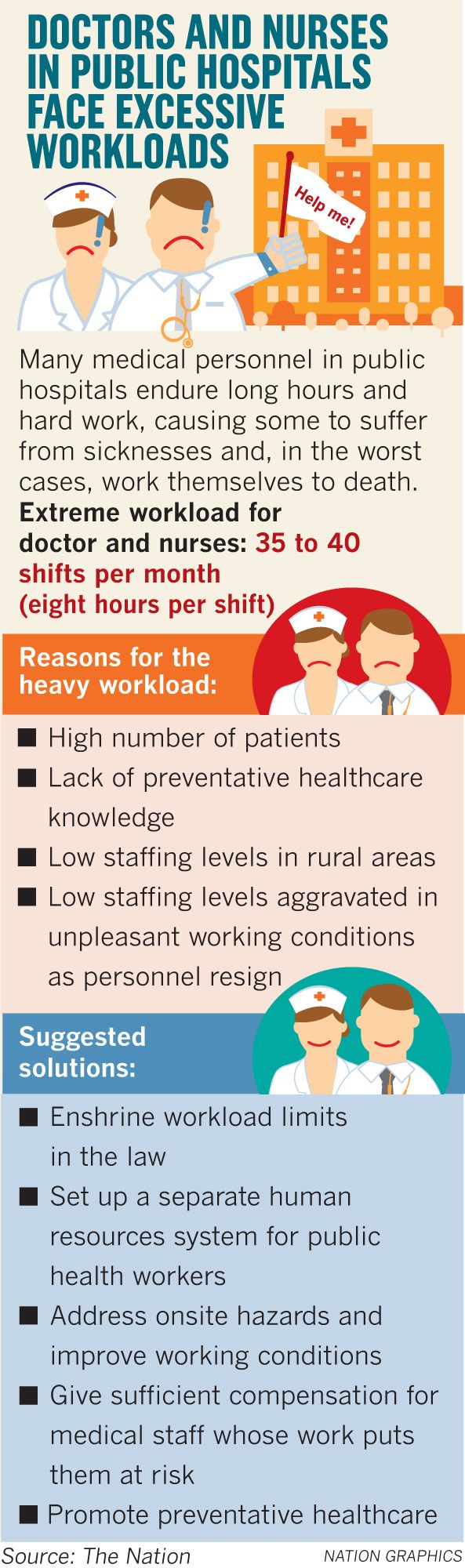 totally wrong. In reality, the public hospital doctors work very hard for unacceptably long hours. Some have to work up to 40 shifts per month. Compare that to normal workers, who work eight hours for 20 to 22 days per month,” Cherdchoo said.