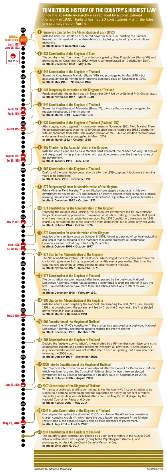 With its new charter – the 20th – promulgated in early April, Thailand has joined the league of countries with the most constitutions.