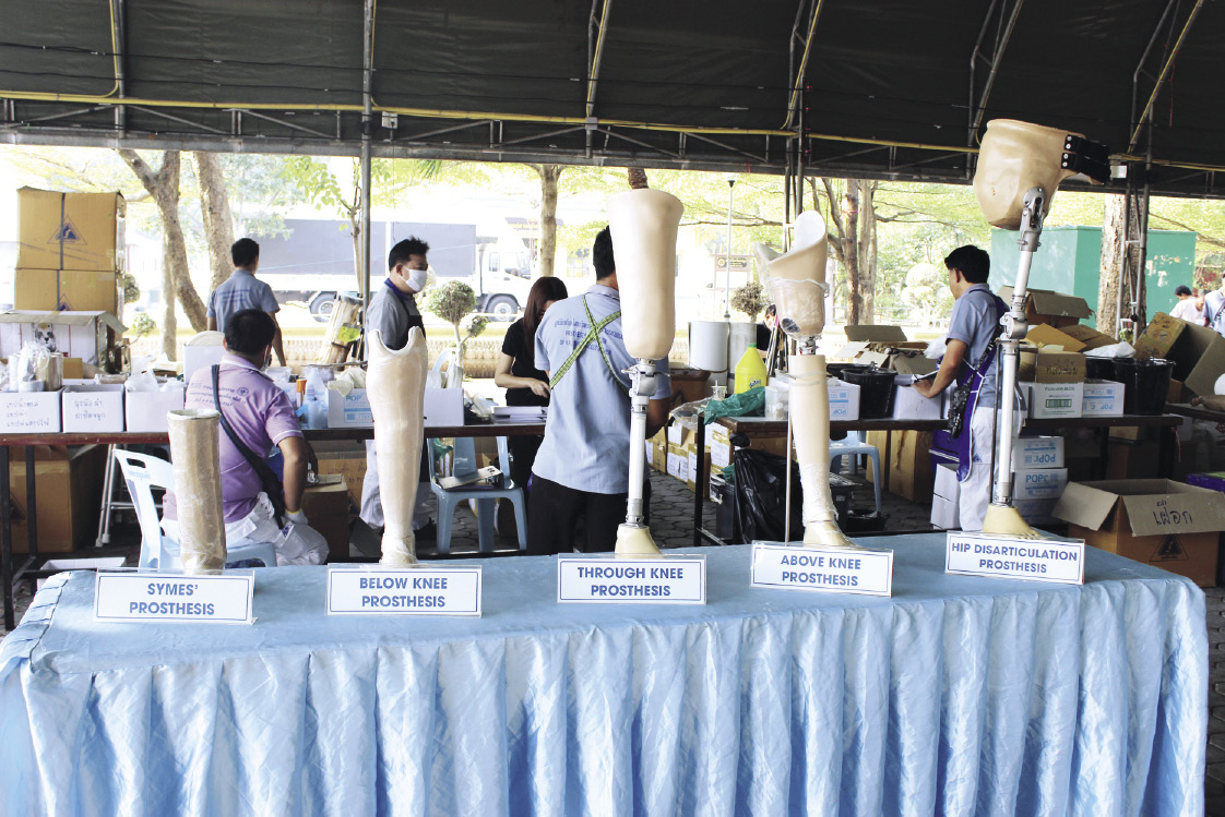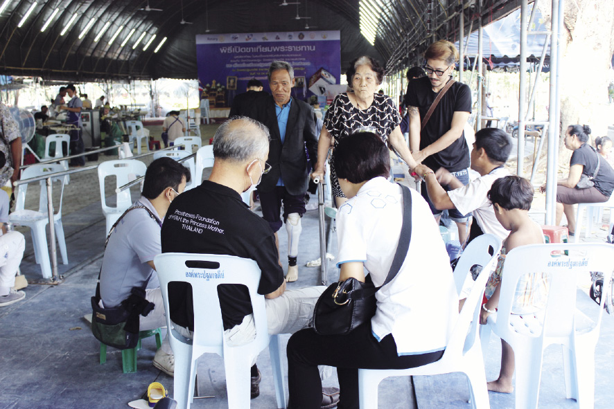 ตลอดทั้งวันของการออกหน่วยครั้งนี้ มีญาติๆ ของผู้พิการที่ประสงค์ขอรับขาเทียมพระราชทาน มาวัดสัดส่วน ดูลักษณะ รอบขาที่พิการว่าเป็นแบบไหน โค้งเว้าอย่างไร เพื่อประเมินว่าต้องใส่ขาเทียมในรูปแบบใดจึงจะเหมาะสมทำให้สามารถช่วยเหลือตัวเองเดินได้อย่างเป็นธรรมชาติมากที่สุด โดยมีเจ้าหน้าที่ อาสาสมัคร ช่างหลอม ช่างหล่อร่วม 30 ชีวิต คอยให้บริการ