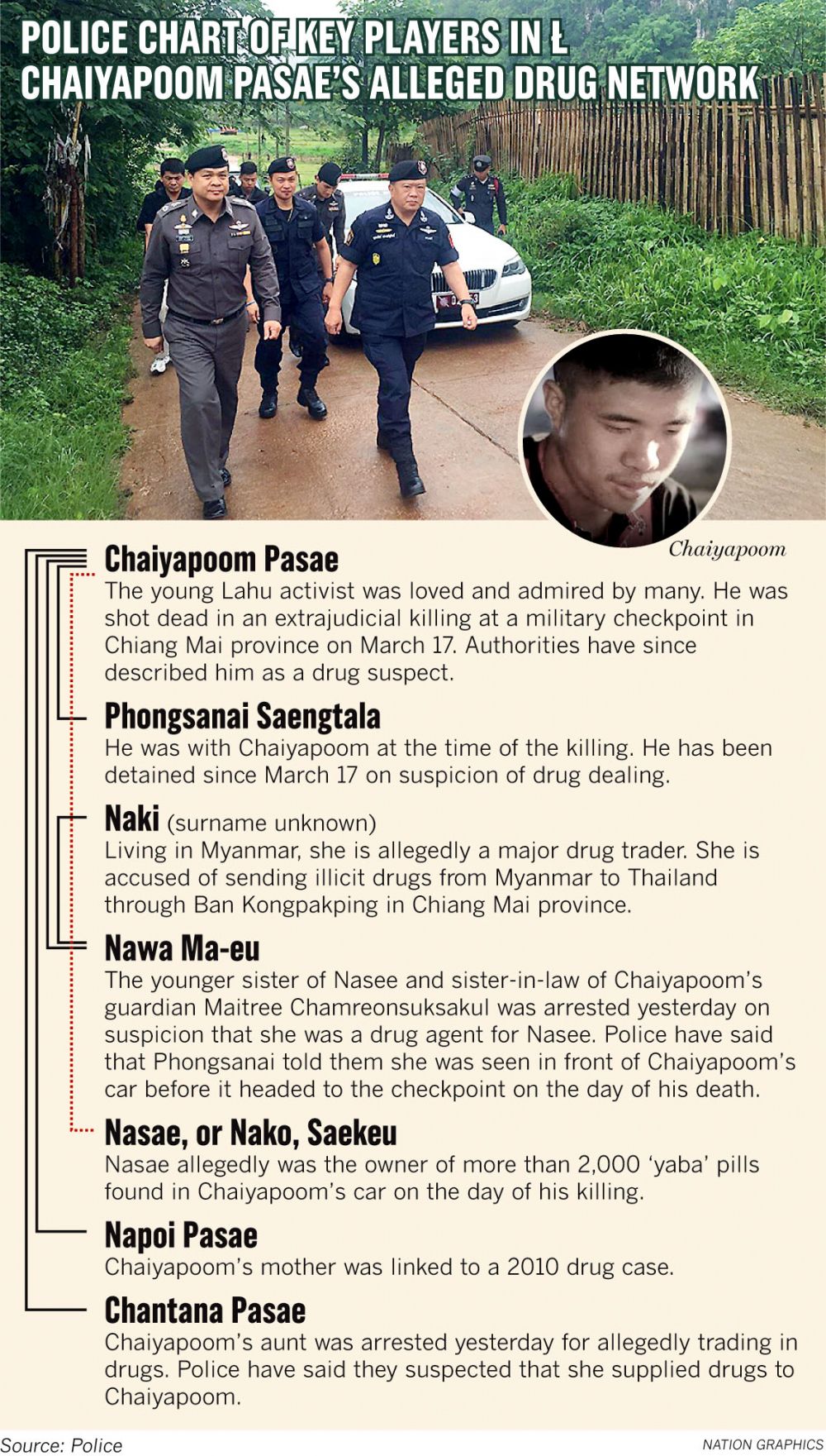 Detained during the raids were Chaiyapoom’s 20-year-old aunt Chantana Pasae, her 25-year-old husband Jajomsaeng Morkoo, Nasae Saekeu and Chaiyapoom’s guardian’s sister-in-law Nawa Ma-eu. All remained in custody yesterday on drug charges.