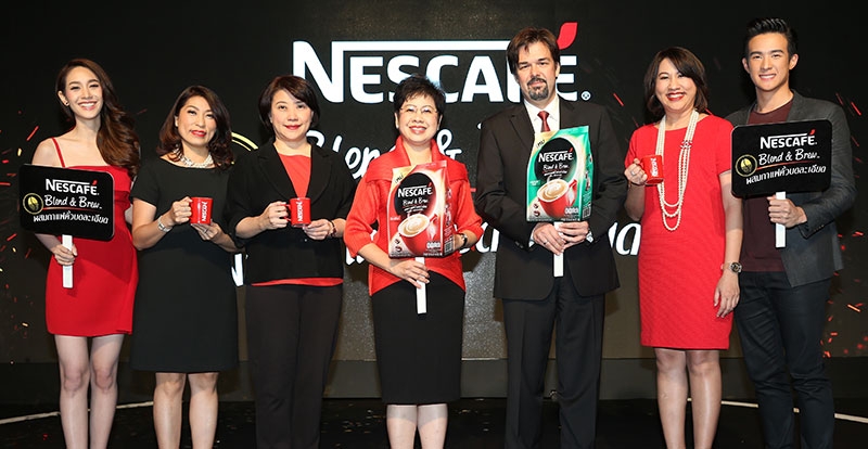 รสชาติกาแฟแท้ : ออดรีย์ เลียว ประธาน กก.และประธานคณะผู้บริหารเนสท์เล่ อินโดไชน่าพร้อมด้วยผู้บริหารจาก บจ.เนสท์เล่ (ไทย) แวลดดิสลาฟ อังดรีฟ, สมฤดี บุญให้เจริญ, พัทนัย เหลืองตระกูล และ มุนินทร์ สุภานุรัตน์ ร่วมสร้างปรากฏการณ์เปิดตัว “เนส กาแฟ เบลนด์ แอนด์ บรูผสมกาแฟคั่วบดละเอียด” ใหม่ โดยมี มิน-พีชญา วัฒนามนตรี และ เจมส์ มาร์ แบรนด์แอมบาสซาเดอร์ของ เนสกาแฟ เบลนด์ แอนด์ บรู มาร่วมงาน ณ โรงแรมดับเบิ้ลยู กรุงเทพฯ