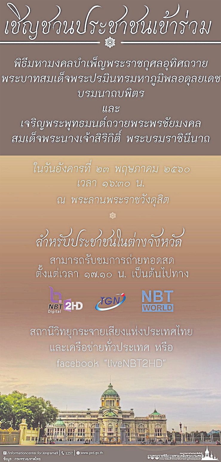 หนังสือลงนามโดย สุทธิพงษ์ จุลเจริญ รองปลัดกระทรวงมหาดไทย ปฏิบัติราชการแทนกระทรวงมหาดไทย วันที่ 18 พ.ค. 2560 ถึงผู้ว่าราชการจังหวัดทุกจังหวัด แจ้งว่า สมเด็จพระเจ้าอยู่หัวทรงพระกรุณาโปรดเกล้าฯ ให้มีการจัดพิธีบำเพ็ญกุศลถวายพระบาทสมเด็จพระปรมินทรมหาภูมิพลอดุลยเดช บรมนาถบพิตร และเจริญพระพุทธมนต์ถวายพระพรชัยมงคลสมเด็จพระนางเจ้าสิริกิติ์ พระบรมราชินีนาถ ในวันอังคารที่ 23 พ.ค. 2560 เวลา 16.30 น. ณ พระลานพระราชวังดุสิต ประกอบกับเมื่อวันพุธที่ 17 พ.ค. 2560 ที่ประชุมส่วนราชการที่เกี่ยวข้องในการจัดพิธีฯ ได้มีมติมอบหมายให้กระทรวงมหาดไทยแจ้งทุกจังหวัดจัดพิธีบำเพ็ญกุศลฯ ในวันและเวลาดังกล่าว ในการนี้ กระทรวงมหาดไทยจึงขอให้จังหวัดดำเนินการ ดังนี้