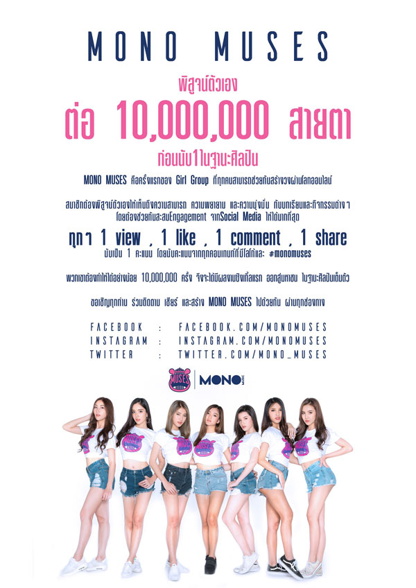 “ก่อนหน้านี้โมโนมิวสิคปั้นศิลปินเกิร์ลกรุ๊ปและบอยแบนด์ประสบความสำเร็จมาแล้วหลายเบอร์ เมื่อเราจะมีศิลปินกลุ่มใหม่ขึ้นมา จึงอยากที่จะหาศิลปินที่มีความพร้อมจริงๆ มาทำงานด้วยกัน จึงเป็นที่มาของโปรเจคนี้ โมโน มิวส์เซส เพื่อให้น้องๆ ได้พิสูจน์ตัวเองในการก้าวมาเป็นศิลปินมีผลงานเพลง ซึ่งไม่ใช่เรื่องง่าย เพราะน้องๆ จะต้องค่อยๆ เติบโตสร้างตัวเอง และใกล้ชิดกับแฟนคลับตัวเองให้มากที่สุด ซึ่งเราสร้างกติกาไว้ว่าทุกคนต้องพิสูจน์ตัวเองให้เห็นถึงความสามารถ ความพยายาม และความมุ่งมั่น กับบทเรียนกิจกรรมที่น้องๆ โมโน มิวส์เซส ทั้ง 7 คนจะต้องช่วยกันสะสมยอดวิว, ยอดไลก์, ยอดคอมเม้นท์, ยอดแชร์ จากโลกออนไลน์ให้มากที่สุด อย่างน้อย 10,000,000 สายตา (นับคะแนนจากทุกคอนเทนต์ที่มีโลโก้ และ #monomuses) เมื่อทำได้ตามเป้าทุกคนจึงจะมีโอกาสเป็นศิลปินมีผลงานเพลง ซึ่งน้องๆ ที่เข้าร่วมโปรเจคโมโน มิวส์เซส จะต้องสร้างความต่างและความน่าสนใจในทุกๆ วัน ผ่านสื่อโซเชี่ยลมีเดียต่างๆ ทั้ง Facebook : MONOMUSES, IG : MONOMUSES, TWITTER : MONO_MUSES ฝากน้องๆ กลุ่มนี้ให้ได้ติดตามด้วยนะครับ”