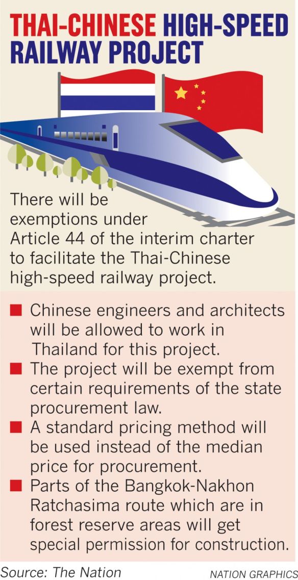 PRIME Minister Prayut Chan-o-cha is expected to issue a sweeping order under Article 44 of the interim charter to grant multiple legal exemptions to the Thai-Chinese high-speed rail project, which has been delayed for almost two years.