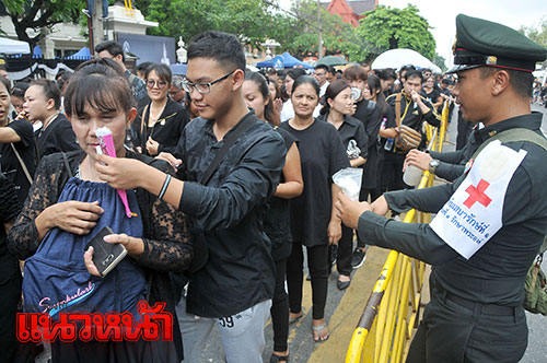 โดย เมื่อ 16 ต.ค.59 กองทัพบก ได้นำรถประปาสนาม 1 คัน จากกองทัพภาคที่ 1 เข้าไปผลิตน้ำดื่มเพื่อบริการประชาชน ได้นำชุดแพทย์จากกรมแพทย์ทหารบกออกบริการด้านการแพทย์และการปฐมพยาบาลให้กับประชาชนบริเวณโดยรอบพระมหาราชวัง และได้จัดรถครัวสนามเคลื่อนที่ จำนวน 3 คัน สามารถปรุงอาหารสดจำนวน 10,000 ชุดต่อวัน โดยใช้ภาชนะที่เป็นมิตรกับสิ่งแวดล้อม นำไปแจกจ่ายประชาชนในมื้อกลางวัน และมื้อเย็น บริเวณมหาวิทยาลัยธรรมศาสตร์ ทั้งนี้ กองทัพบก กำลังประสานงานกับทุกภาคส่วนที่มาให้บริการประชาชนในบริเวณพระบรมมหาราชวัง และท้องสนามหลวง เพื่อบูรณาการร่วมกันจัดระบบ จัดระเบียบ และบริหารจัดการพื้นที่ให้มีความเรียบร้อย มีช่องทางการเข้าถึงการบริการของหน่วยงานต่างๆ ได้อย่างชัดเจน เพื่อให้การเข้ามาถวายความอาลัยของพสกนิกรได้รับการดูแลอย่างดีที่สุด