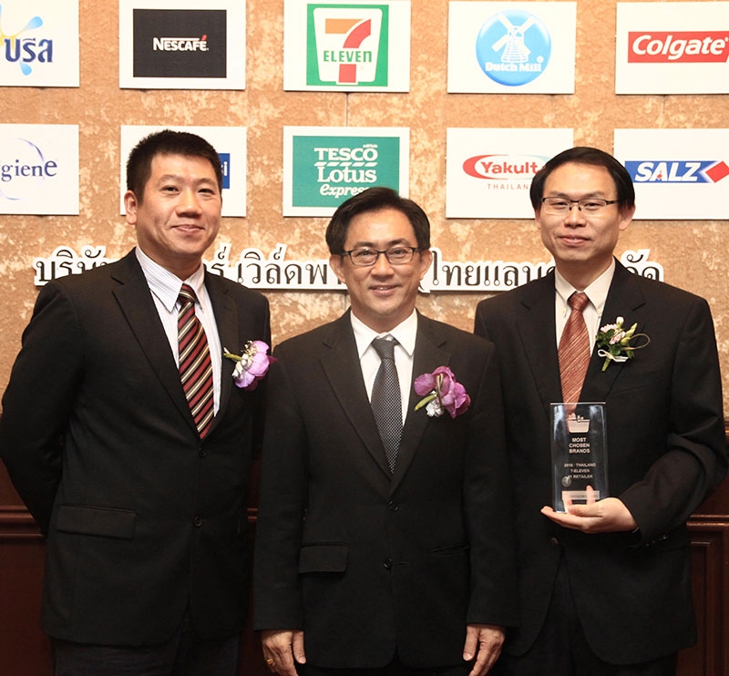 สูงสุดในกลุ่มผู้ค้าปลีก : ยุทธศักดิ์ ภูมิสุรกุล รอง กก.ผจก.อาวุโส บมจ.ซีพี ออลล์ รับรางวัลชนะเลิศ “สุดยอดแบรนด์ที่ผู้บริโภคเลือกซื้อสูงสุดในประเทศไทย” จากผลวิจัยที่จัดทำโดย บริษัท กันตาร์ เวิร์ลดพาแนล จำกัด (KWP) โดยมี พูนพงษ์ นัยนาภาภรณ์ ผอ.กองส่งเสริมและพัฒนาธุรกิจ กระทรวงพาณิชย์ และ มร.ฮาร์เวิร์ด ชาง กก.ผจก.บจก.กันตาร์ เวิร์ลดพาแนล (ไทยแลนด์) ร่วมกันมอบให้ที่โรงแรมอินเตอร์คอนติเนนตัล ราชประสงค์