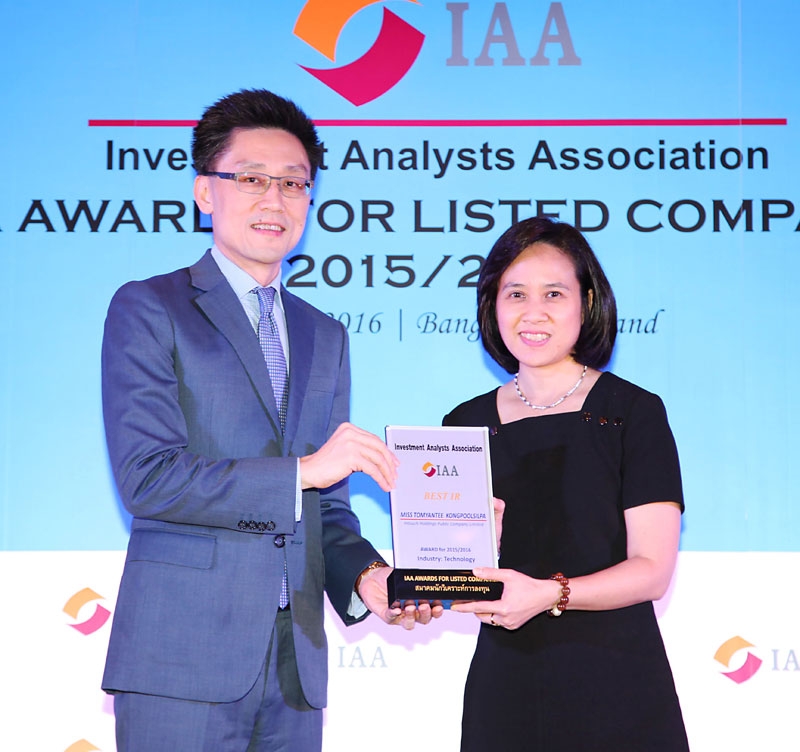 Best IR : ทมยันตี คงพูลศิลป์ ผช.กก.ผอ.ด้านนักลงทุนสัมพันธ์ บมจ.อินทัช โฮลดิ้งส์ รับรางวัลนักลงทุนสัมพันธ์ยอดเยี่ยม ในกลุ่มอุตสาหกรรมเทคโนโลยี จาก ไพบูลย์ นลินทรางกูร นายกสมาคมนักวิเคราะห์การลงทุน ในงาน “IAA Awards for Listed Companies”
