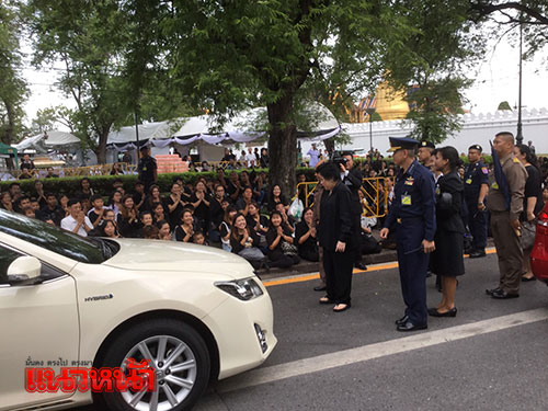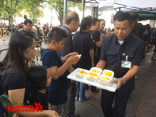 ด้านนางสายสม กล่าวว่า พระองค์โสมฯ เสด็จมาทอดไก่ด้วยพระองค์เอง เพราะอยากช่วยเหลือราษฏรที่มาต่อแถวถวายความอาลัย และทรงอยากมาให้กำลังใจเจ้าหน้าที่กาชาดที่ทอดไก่แจกประชาชนเป็นวันที่ 5 แล้ว และทรงรับสั่งให้มูลนิธิ ได้เพิ่มจำนวนไก่ ซึ่งวันนี้ใช้ไก่ จำนวน 600 กก. ข้าวเหนียว 300 กก. ได้ข้าวเหนียวไก่ประมาณ 5 พันกว่าชุด ก็ให้เพิ่มเป็นไก่ 1,000 กก. เพิ่มข้าวเหนียวเป็น 500 กก. เนื่องจากวันที่ 22 ต.ค.จะมีกิจกรรมร้องเพลงสรรเสริญพระบารมีที่ท้องสนามหลวง ประกอบกับเป็นวันหยุดราชการจึงคาดว่าจะมีประชาชนเดินทางมาจำนวนมาก นอกจากนี้ ยังรับสั่งให้แพทย์ของมูลนิธิฯ เข้มงวดในเรื่องความสะอาดของอาหารที่แจกจ่าย และทรงย้ำให้แจกจ่ายให้ประชาชนอย่างให้ทั่วถึงด้วย