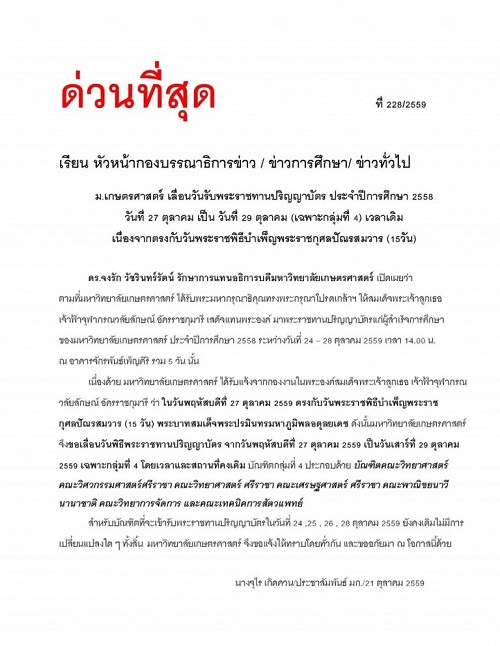 21 ต.ค.59 ดร.จงรัก วัชรินทร์รัตน์ รักษาการแทนอธิการบดีมหาวิทยาลัยเกษตรศาสตร์ (มก.) เปิดเผยว่า มก. ได้เลื่อนรับพระราชทานปริญญาบัตร เฉพาะกลุ่มที่ 4 จากวันพฤหัสบดีที่ 27 ต.ค. เป็นวันเสาร์ที่ 29 ต.ค. โดยเวลาคงเดิม เนื่องจากตรงกับวันพระราชพิธีบำเพ็ญพระราชกุศลปัณรสมวาร (15 วัน) พระบาทสมเด็จพระปรมินทรมหาภูมิพลอดุลยเดช สำหรับบัณฑิตที่รับพระราชทานปริญญาบัตรในวันที่ 24, 25, 26, และ 28 (กลุ่ม 1, 2, 3 และ 5) ยังคงเดิมไม่เปลี่ยนแปลง