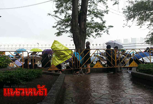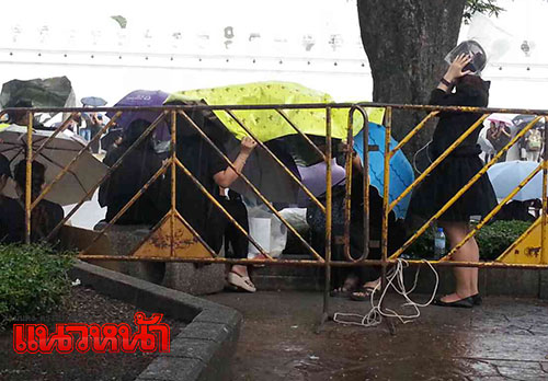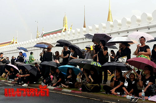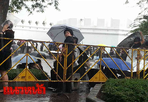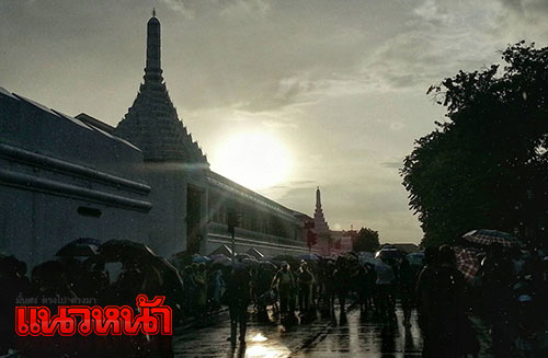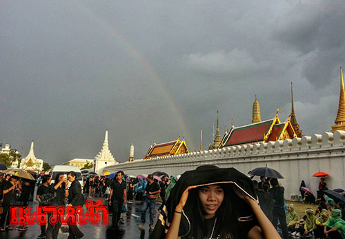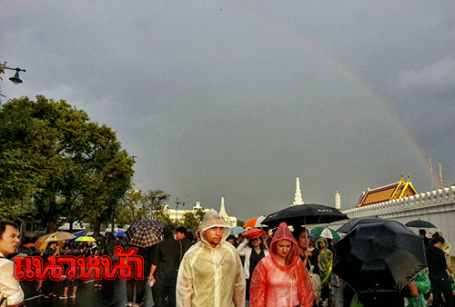 22 ต.ค. 59 เมื่อเวลา 17.20 น. ภายหลังจากที่ฝนได้ตกลงมายังบริเวณท้องสนามหลวง และหน้าพระบรมมหาราชวัง นั้น ผู้สื่อข่าวรายงานว่า ประชาชนยังคงเฝ้ารอเป็นจำนวนมากเพื่อเข้าถวายสักการะเบื้องหน้าพระบรมฉายาลักษณ์ และลงนามสมุดหลวงถวายความอาลัยพระบรมศพพระบาทสมเด็จพระปรมินทรมหาภูมิพลอดุลยเดช และร่วมร้องเพลงสรรเสริญพระบารมี ในรอบที่สอง เวลา 22.00 น.ทั้งนี้ หลังจากที่ฝนได้เบาลง ได้เกิดรุ้งกินน้ำขึ้นเหนือวัดพระศรีรัตนศาสดาราม พาดผ่านมายังสนามหลวง บริเวณที่มีการจัดงานร้องเพลงสรรเสริญพระบารมี สร้างความประทับใจให้แก่ผู้พบเห็นเป็นจำนวนมาก