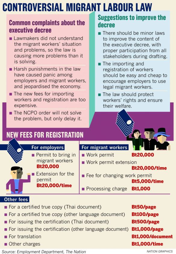 The suspended articles of the Executive Decree on Migrant Workers Management involve harsh punishments for illegal migrant workers and their employers. For example, the fine imposed on employers will range from Bt400,000 to Bt800,000 per illegal worker under the new law.