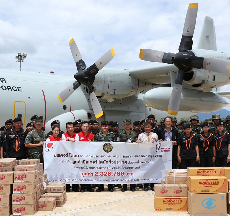 เพื่อทหารกล้า : สุชีพ ธรรมาชีพเจริญ รอง กก.ผจก.ใหญ่ ซีอาร์จี และ กันตภณ ศรีสุวรรณ ผช.กก.ผจก.ใหญ่ มิสเตอร์ โดนัท มอบเงิน และสิ่งของแก่ พล.ต.เอกรัตน์ ช้างแก้ว ผู้บังคับหน่วยเฉพาะกิจนราธิวาส ที่ สนามบินบ้านทอน จ.นราธิวาส