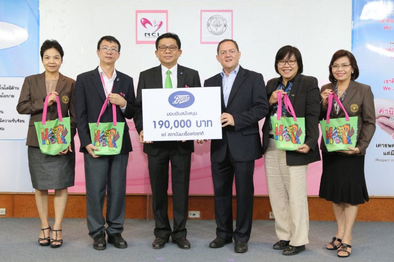 รับมอบ : บู๊ทส์ ประเทศไทย นำโดย ดีน ทอมป์สัน ผอ.ระดับภูมิภาคเอเชีย และ มลฤดี เลิศอุทัย ผอ.ฝ่ายบริหารงานค้าปลีก บริษัท บู๊ทส์ รีเทล (ประเทศไทย) จำกัด มอบเงินบริจาคจำนวน 190,000 บาท โดยมี นพ.วีรวุฒิ อิ่มสำราญ ผู้อำนวยการสถาบันมะเร็งแห่งชาติ รับมอบ เนื่องในโอกาสบู๊ทส์ รีเทล (ประเทศไทย) ฉลองครบรอบ 19 ปี