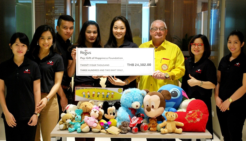 แบ่งปันความสุข : วิมลนิตย์ เลิศพิทักษ์กิจ ผอ.ฝ่ายขายและปฏิบัติการ บ.รีจัส ประเทศไทย นำทีมพนักงานร่วมบริจาคเงินจำนวน 24,302 บาท ให้กับมูลนิธิ “Gift of Happiness” เพื่อนำไปซื้อชุดนักเรียน และอุปกรณ์การเรียน ให้กับเด็กๆ ยากไร้ในชนบท โดยมี มร.เอ็ดเวิร์ด ฮอเวิร์ท เป็นผู้รับมอบ ณ สำนักงานรีจัส สาขาเอไอเอเซ็นเตอร์