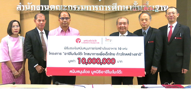 งบฯ ปี 2559 : พิเชียร คูสมิทธิ์ รองประธานมูลนิธิอายิโนะโมะโต๊ะ มอบเงิน 10 ล้านบาทให้แก่ สนิท แย้มเกษร ที่ปรึกษาฯ สำนักงานคณะกรรมการการศึกษาขั้นพื้นฐาน (สพฐ.) เพื่อใช้ก่อสร้างอาคารโรงอาหารให้แก่ 10 โรงเรียนที่ขาดแคลน โครงการ “อายิโนะโมะโต๊ะโภชนาการเพื่อเด็กไทย ก้าวไกลสร้างชาติ” ที่ สพฐ.