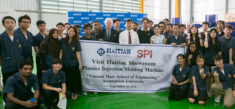 เรียนรู้ดูจริง : ผศ.ดร.จิรเดช คงทน และ ดร.โรเบิร์ต ฟาร์เรล นำนักศึกษา คณะวิศวกรรมศาสตร์ มหาวิทยาลัยอัสสัมชัญ ฟังบรรยายและเยี่ยมชม กระบวนการทำงานของเครื่องฉีดพลาสติก ยี่ห้อ “ไห่เทียน” โดยมี โจ จันทร์ล้วน ผอ.ฝ่ายขาย บจก.เอสพี อินเตอร์แมค เป็นวิทยากร ที่โชว์รูมไห่เทียน ถ.มอเตอร์เวย์
