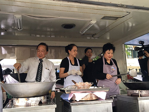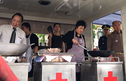 โดยในวันนี้ ทางมูลนิธิฯ ได้นำไก่มาทอดแจกจ่ายให้แก่ประชาชน จำนวน 1,300 กิโลกรัม และข้าวเหนียว 500 กิโลกรัม นอกจากนี้ ยังมีไอศครีมกระทิสดมาแจกจ่ายด้วย จำนวน 2 ถัง โดยมีกอล์ฟ-พิชญะ และ ไมค์-พิรัชต์ นิธิไพศาลกุล ดารานักร้อง พร้อมครอบครัว และ จิ๊บ-วสุ แสงสิงแก้ว จ๊ะจ๋า-พริมรตา เดชอุดม มาร่วมแจกข้าวเหนียวไก่ทอดด้วย