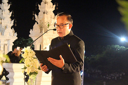 เริ่มต้นด้วยการบรรเลงบทเพลงพระราชนิพนธ์ โดย วงดนตรีจากวิทยาลัยดุริยศิลป์ มหาวิทยาลัยพายัพ พร้อมการฉายภาพพระราชกรณียกิจพระบาทสมเด็จพระปรมินทรมหาภูมิพลอดุลยเดชและบรรเลงเพลง “ลมหนาว”ต่อด้วยการกล่าวสดุดี และถวายความอาลัย โดย นายปวิณ ชำนิประศาสน์ ผู้ว่าราชการจังหวัดเชียงใหม่